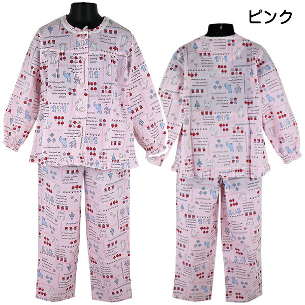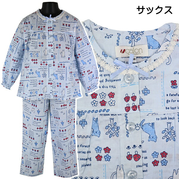 綿100% パジャマ 上下セット 子供 女児 長袖 シーチング シャツ 薄手 Calon ネコ総柄 ヨーク切替 120-150cm【送料無料】